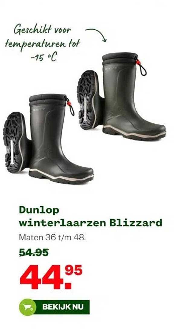 Ben je op zoek naar de perfecte winterlaarzen die warm en comfortabel zijn? Kijk dan niet verder! De Dunlop winterlaarzen Blizzard zijn nu verkrijgbaar met een aantrekkelijke korting. Geschikt voor temperaturen tot -15 °C, zijn deze laarzen ideaal voor winterse dagen, of je nu gaat wandelen, tuinieren of gewoon een boodschap doet. Met een prijsverlaging van €54,95 naar €44,95, mis je deze kans niet!