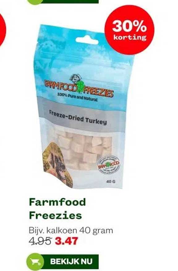 Bekijk nu de Farmfood Freezies bijv. kalkoen 40 gram aanbieding in de Welkoop folder. Deze aanbieding is geldig van 17-11-2025 tot en met 23-11-2025.