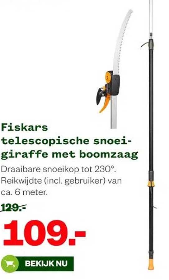 Heb je ooit last gehad van struiken en takken die gewoon te hoog zijn om met een gewone snoeischaar bij te komen? De Fiskars telescopische snoeigiraffe met boomzaag is nu verkrijgbaar voor een geweldige prijs, waardoor dit het perfecte moment is om je tuin onder handen te nemen. Met een reikwijdte van maar liefst 6 meter, kun je eenvoudig takken snoeien zonder een ladder te gebruiken.