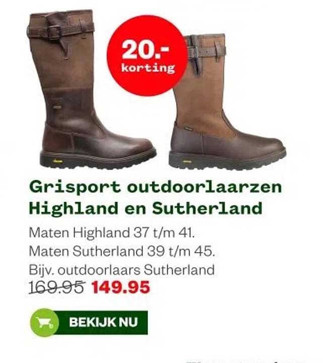 Ben je op zoek naar de perfecte outdoorlaarzen voor jouw avonturen in de natuur? Dan is deze aanbieding iets voor jou! De Grisport outdoorlaarzen Highland en Sutherland bieden niet alleen comfort maar ook uitstekende bescherming tijdens je buitenactiviteiten. Met een aantrekkelijke korting van €20,- is dit een kans die je niet wilt missen. Laat je verblinden door de kwaliteit en prijs van deze laarzen, nu tijdelijk verkrijgbaar bij Welkoop!