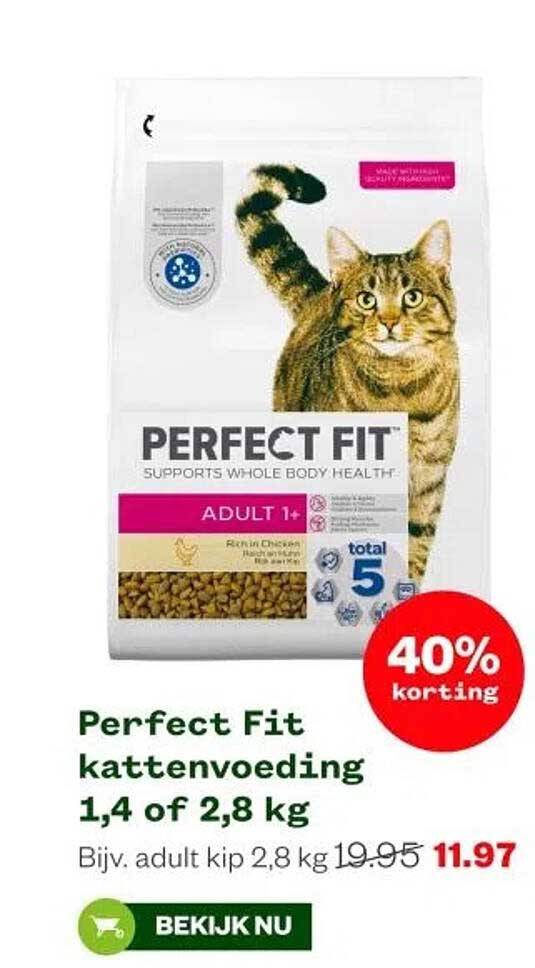 Heb je een geweldige voeding voor je kat nodig? Dan moet je zeker deze aanbieding van Perfect Fit kattenvoeding bekijken! Deze voeding is speciaal ontwikkeld om de gezondheid van je kat te ondersteunen. Met een flinke korting van 40%, is dit het perfecte moment om je huisdier te verwennen zonder je budget te overschrijden.