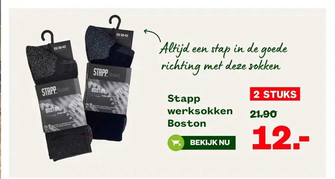 Bekijk nu de Stapp werksokken Boston aanbieding in de Welkoop folder. Deze aanbieding is geldig van 14-04-2025 tot en met 27-04-2025.