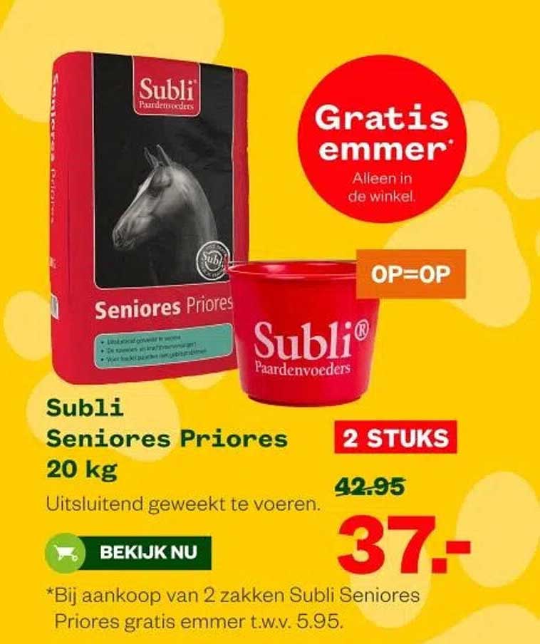 Heb je een oudere of speciale paard dat extra aandacht nodig heeft? Dan is de aanbieding van de Subli Seniores Priores nu echt iets voor jou! Deze hoogwaardige paardenvoeding, speciaal ontworpen voor oudere paarden, biedt de juiste balans van voeding en is ideaal voor hun unieke behoeften. Geniet van de heerlijke korting en zorg goed voor jouw viervoeter met producten van topkwaliteit!
