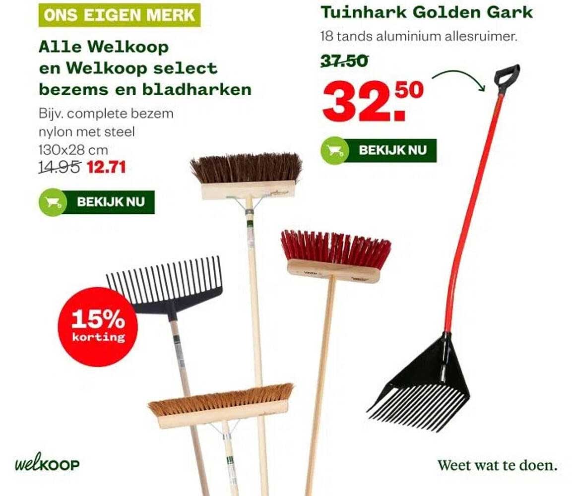 Ben je op zoek naar een betrouwbare en veelzijdige tuinhark? Dan is de Tuinhark Golden Gark iets voor jou! Deze sterke hark is perfect voor het opruimen van bladeren, gras en ander tuinafval. Met een aantrekkelijke korting van 15% kun je nu profiteren van deze aanbieding van Welkoop, geldig van 13 oktober tot en met 19 oktober 2025. Doe voordeel met deze kans om je tuin onderhoud te vergemakkelijken!