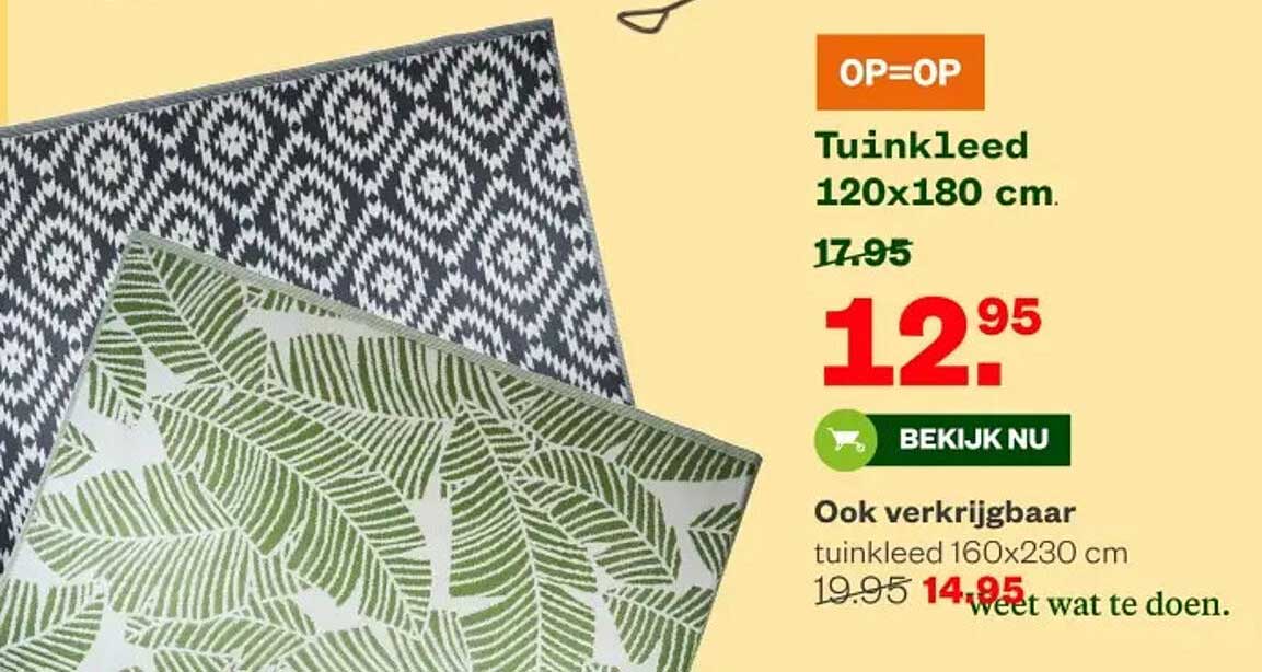 Bekijk nu de Tuinleed 120x180 cm. aanbieding in de Welkoop folder. Deze aanbieding is geldig van 18-08-2025 tot en met 24-08-2025.