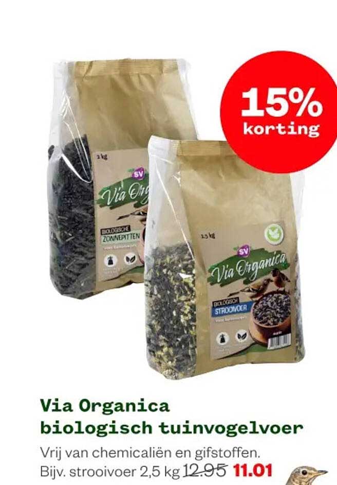 Ben je op zoek naar een gezonde en veilige optie voor je tuinvogels? Dan is deze aanbieding van Via Organica biologisch tuinvogelfvoer precies wat je nodig hebt! Deze kwaliteitsvolle voeding is vrij van chemicaliën en gifstoffen, en biedt een uitstekende bron van voedingsstoffen voor de vogels in jouw tuin. Van 6 tot en met 19 oktober kun je genieten van een aantrekkelijke korting van 15% op dit product. Een ideale gelegenheid om je vogelvoer aan te vullen met een biologisch alternatief!