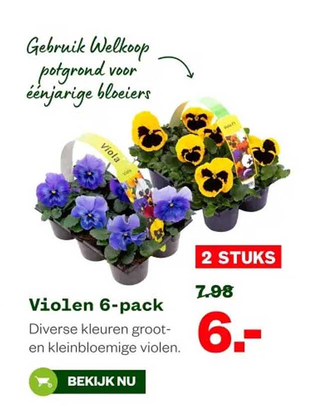 Als je op zoek bent naar een kleurrijke aanvulling voor je tuin of balkon, dan is deze aanbieding van Welkoop echt iets voor jou! De Violen 6-pack biedt je een schitterende mix van groot- en kleinbloemige violen. Met hun levendige kleuren brengen zij direct sfeer en fleurig leven in je buitenruimte.