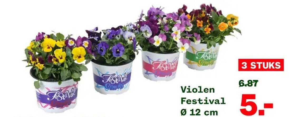 Ben je op zoek naar een kleurrijke aanvulling voor je tuin of balkon? Deze aanbieding van de Violen Festival is precies wat je nodig hebt! Met een set van drie prachtige potten vol levendige viooltjes breng je direct meer kleur en gezelligheid in je buitenruimte. Van 6.87 naar nu slechts 5,- euro is dit een onweerstaanbare kans om je tuin op te fleuren.