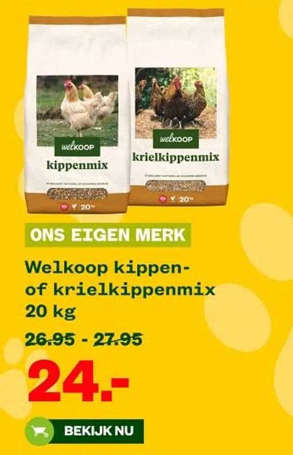 Bekijk nu de Welkoop kippen- of krielkippenmix 20 kg aanbieding in de Welkoop folder. Deze aanbieding is geldig van 29-09-2025 tot en met 05-10-2025.