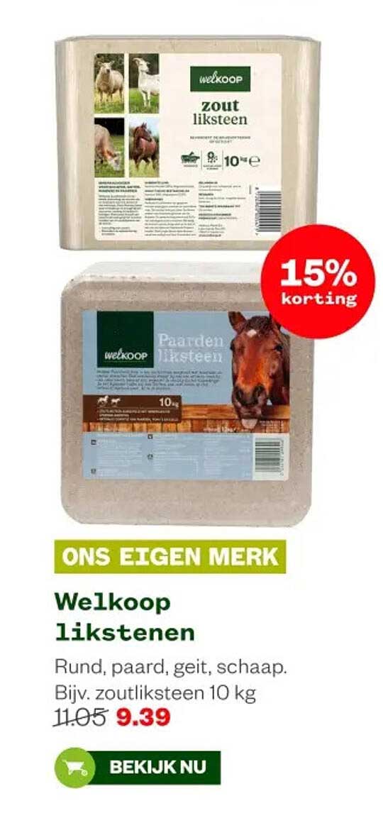 De reguliere prijs van de Welkoop likstenen bedraagt €11,05, maar met de huidige aanbieding betaal je slechts €9,39. Dat betekent een besparing van €1,66! Deze aantrekkelijke prijs maakt het nóg interessanter om nu in te slaan en je dieren de beste zorg te bieden.