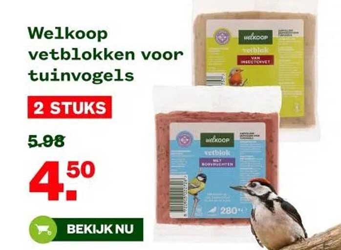 Bekijk nu de Welkoop vetblokken voor tuinvogels 2 STUKS aanbieding in de Welkoop folder. Deze aanbieding is geldig van 27-10-2025 tot en met 02-11-2025.