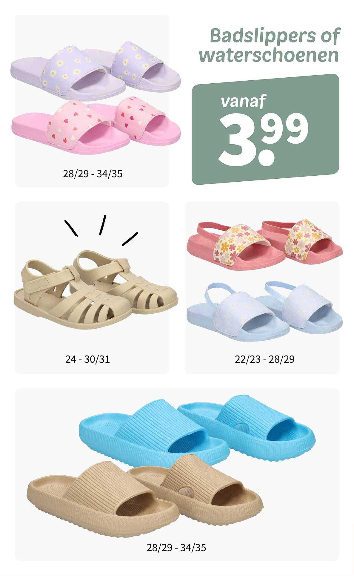 Bekijk nu de Badsandalen of waterschoenen vanaf 3.99 aanbieding in de Wibra folder. Deze aanbieding is geldig van 08-04-2025 tot en met 21-04-2025.