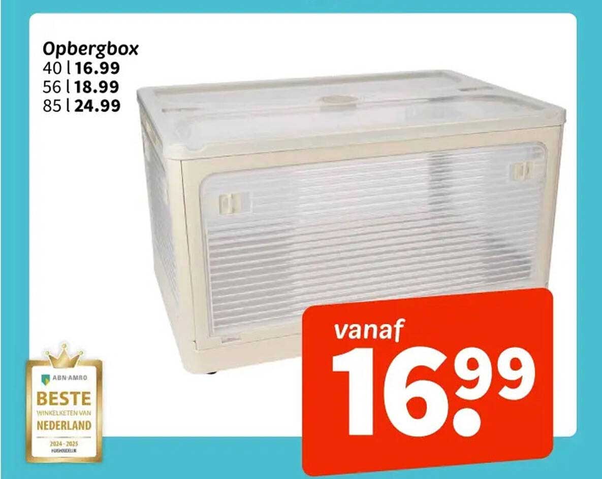 Bekijk nu de Opbergbox aanbieding in de Wibra folder. Deze aanbieding is geldig van 25-06-2025 tot en met 09-07-2025.