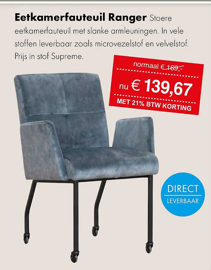 De normale prijs van de Eetkamerfauteuil Ranger is € 169,-, maar dankzij de aanbieding op deze pagina kun je nu profiteren van een scherpe prijs van slechts € 139,67. Dit betekent een aanzienlijke besparing en met de korting van 21% inclusief btw, is dit het perfecte moment om jouw woonkamer een upgrade te geven!
