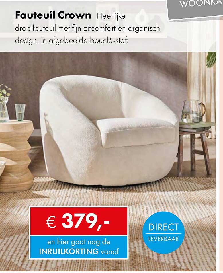 Bekijk nu de Fauteuil Crown aanbieding in de Woonsquare folder. Deze aanbieding is geldig van 16-06-2025 tot en met 22-06-2025.