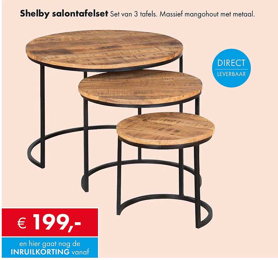 Bekijk nu de Shelby salontafelset Set van 3 tafels. Massief mangohout met metaal. aanbieding in de Woonsquare folder. Deze aanbieding is geldig van 20-10-2025 tot en met 25-10-2025.