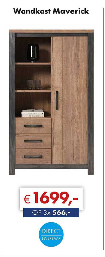 De Wandkast Maverick is nu beschikbaar voor slechts € 1699,-. Dit is een uitstekende prijs gezien de kwaliteit en de functionaliteit. Normaal gesproken zou je meer betalen voor een stuk meubelwerk van deze klasse. Met de mogelijkheid om te betalen in drie termijnen van € 566,-, maak je het je zelf gemakkelijk om deze mooie kast aan te schaffen.