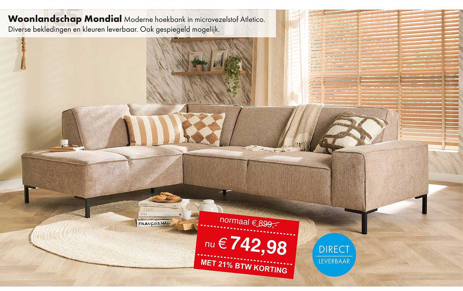 Met een normale prijs van € 899,- is het Woonlandschap Mondial nu te verkrijgen voor slechts € 742,98! Dat is een korting van maar liefst 21% inclusief BTW. Deze aanbieding maakt het mogelijk om een luxe bank in huis te halen zonder je budget te overschrijden. Het is een slimme investering die zeker zijn waarde zal behouden.