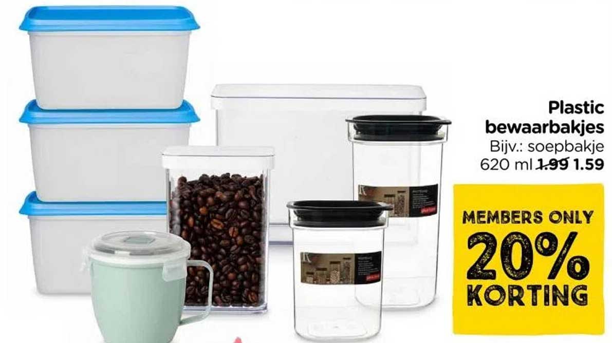 Normaal gesproken kosten deze bewaarbakjes €1,99 per stuk, maar tijdens deze actie voor leden krijg je ze voor slechts €1,59! Dat is een besparing van 20% op je aankoop, wat deze aanbieding nog aantrekkelijker maakt.