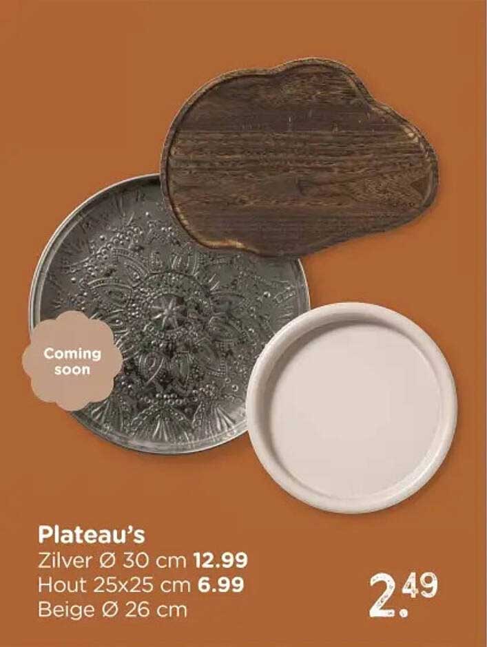 Met de reguliere prijzen van 12,99 euro voor het zilveren plateau, 6,99 euro voor het houten plateau en de aantrekkelijke 2,49 euro prijs voor het beige plateau, bespaar je flink met deze aanbieding. Het is een geweldige kans om je collectie uit te breiden zonder je budget te overschrijden.