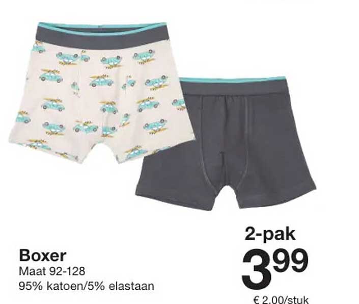 Voor slechts €3,99 voor een 2-pak, betaal je slechts €2,00 per stuk! Een uitstekende prijs-kwaliteitverhouding die je niet wilt missen. Normaal gesproken zouden deze boxers meer kosten, maar met deze aanbieding van Zeeman krijg je waar voor je geld. Vooral voor ouders die op zoek zijn naar goede, duurzame kleding voor hun kinderen is dit een kans die je niet wilt laten liggen.