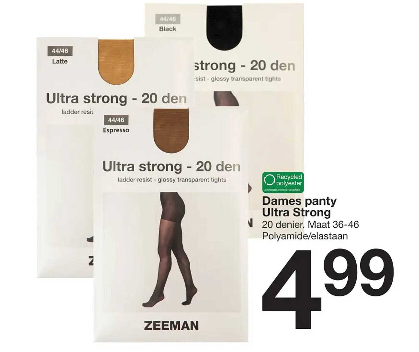 Bekijk de Dames Panty Ultra Strong aanbieding bij Zeeman! Deze fantastische aanbieding is nu beschikbaar in de nieuwste Zeeman folder. Profiteer van deze kans en bespaar flink op je aankoop.
