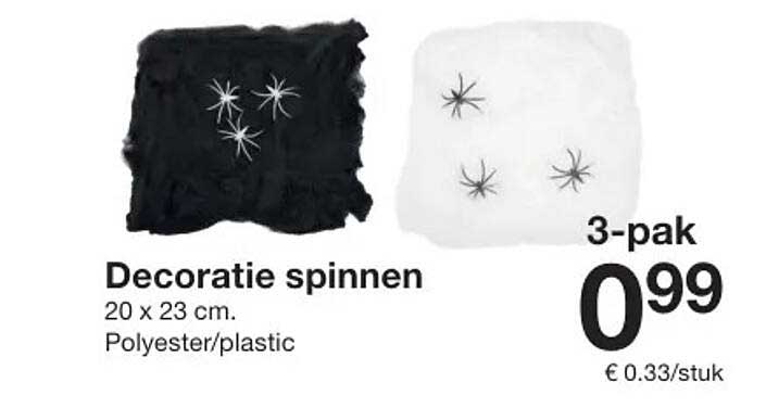 De huidige prijs voor dit 3-pak decoratie spinnen is slechts €0,99, dat is maar €0,33 per stuk! Dit is een geweldige prijs in vergelijking met andere winkels, waar je vaak meer betaalt voor minder. Met deze aanbieding ben je verzekerd van een leuke decoratie zonder je budget te overschrijden.